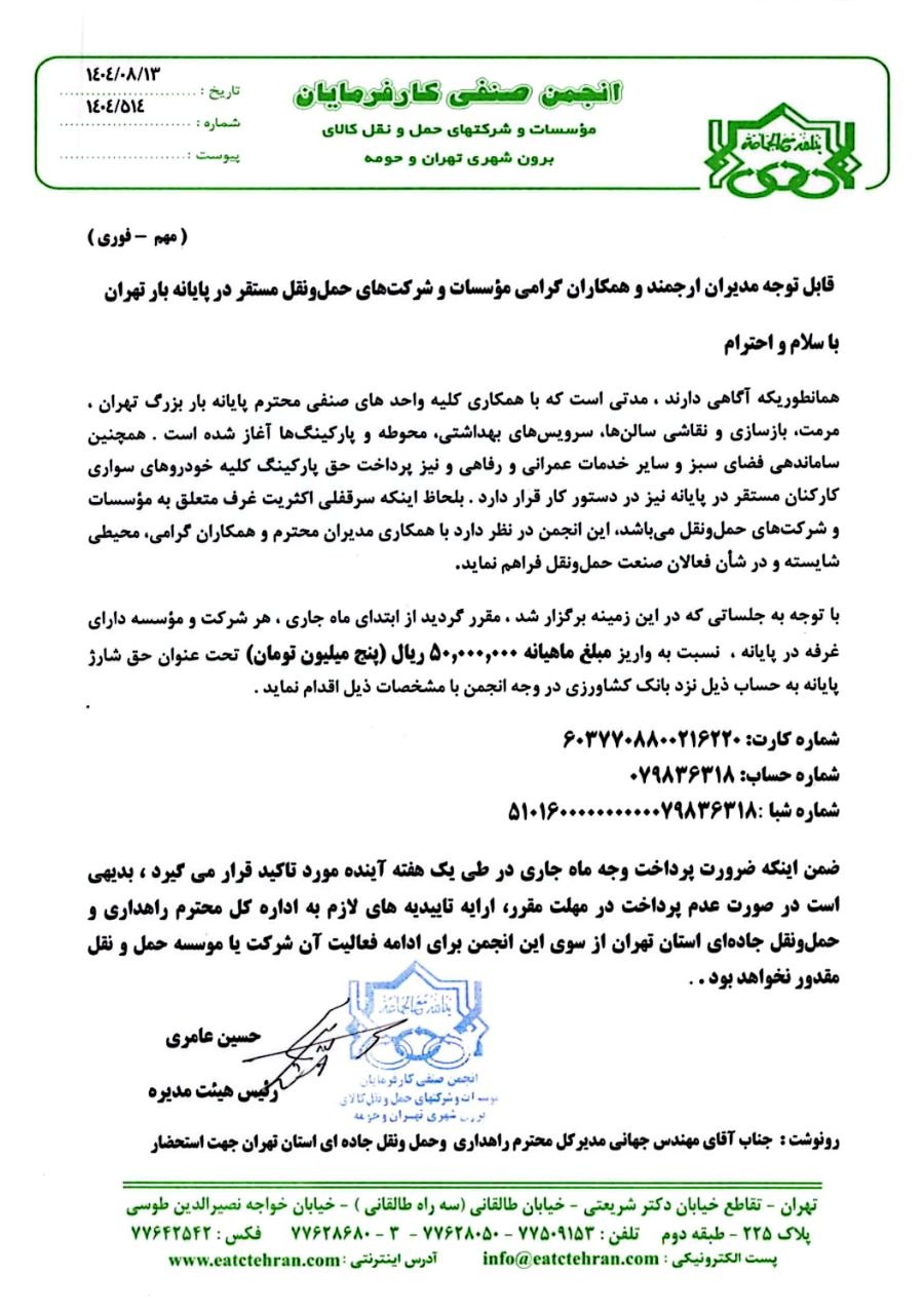 قابل توجه مدیران ارجمند و همکاران گرامی مؤسسات و شرکتهای حملونقل مستقر در پایانه بار تهران