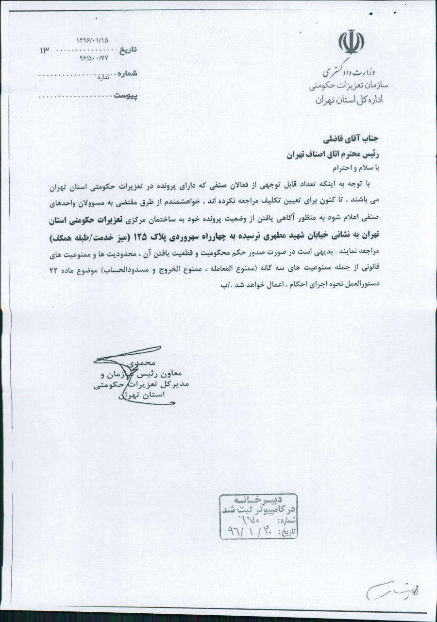 احتراماً، عطف به نامه شماره 2346/ج مورخ 96/01/29 اتاق محترم اصناف تهران به پیوست تصویر نامه شماره 96/500/77 مورخ 96/01/15 سازمان تعزیرات حکومتی استان تهران در خصوص مراجعه فعالان صنفی دارای پرونده مفتوحه در تعزیرات، جهت آگاهی و بهره برداری ارسال می گردد.