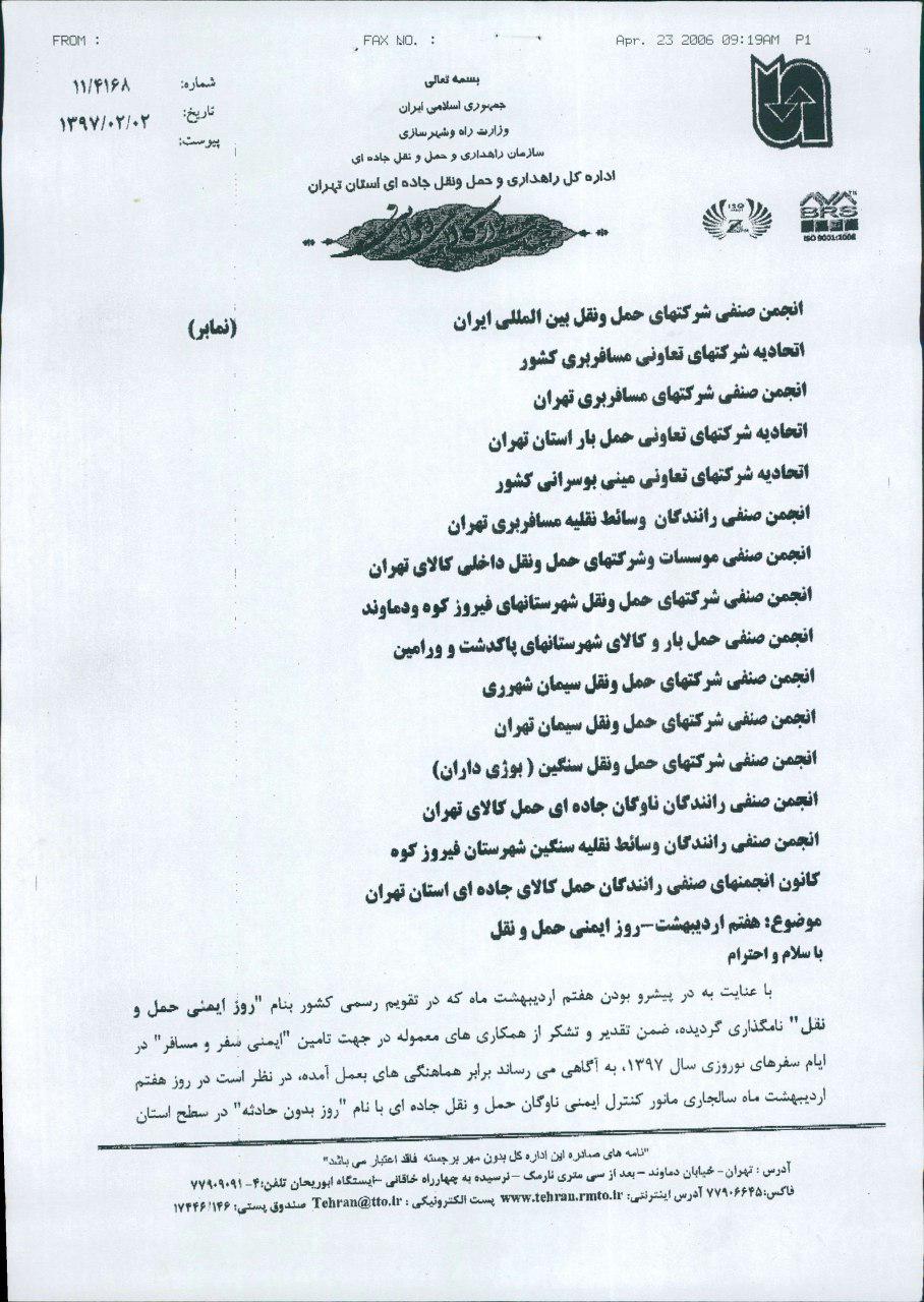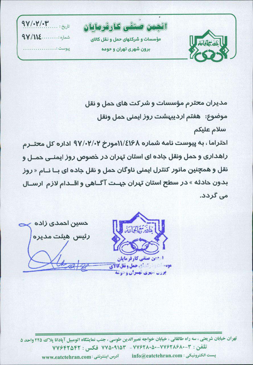 احتراما٬، به پیوست نامه شماره 11/4168 مورخ 97/02/02 اداره کل محترم راهداری و حمل و نقل جادهای استان تهران در خصوص روز ایمنی حمل و نقل و همچنین مانور کنترل ایمنی ناوگان حمل و نقل جاده ای با نام « روز بدون حادثه » در سطح استان تهران جهت آگاهی و اقدام لازم ارسال میگردد.