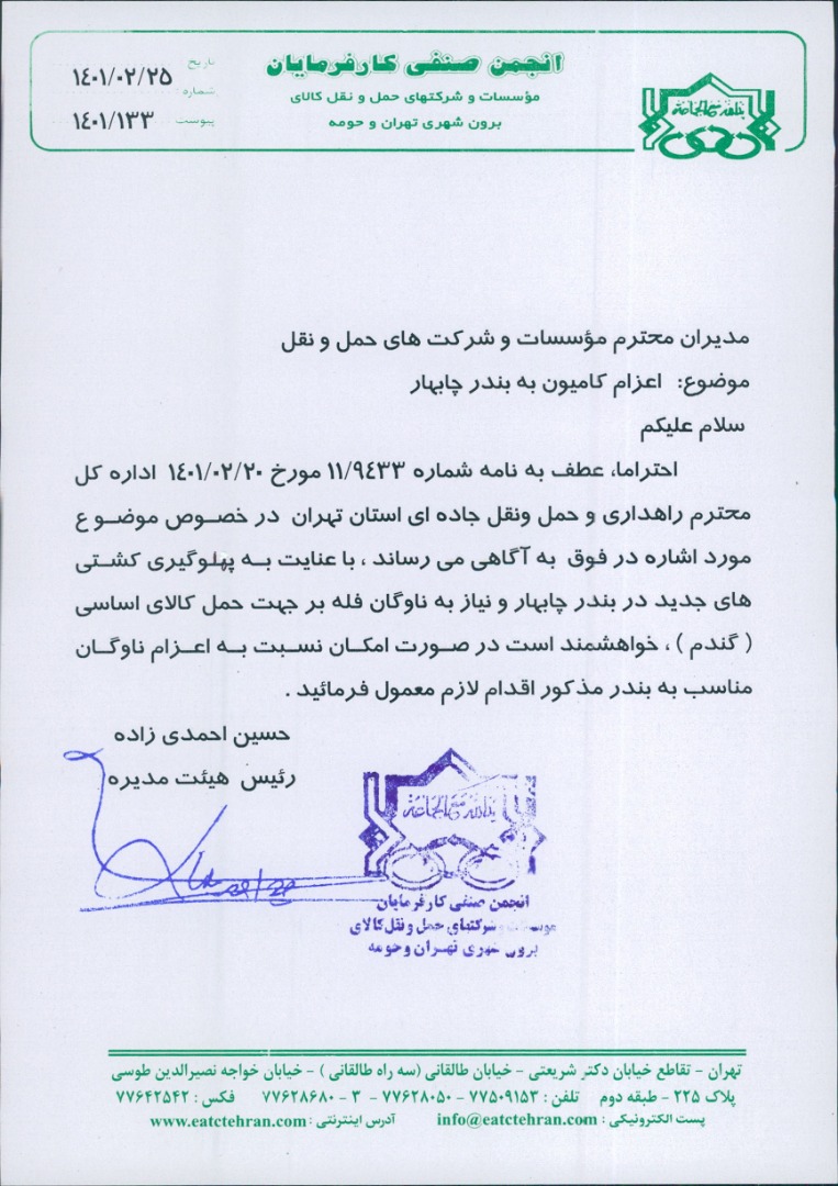 احتراما، عطف به نامه شماره 11/9433مورخ 1401/02/20 اداره کل محترم راهداری و حمل ونقل جاده ای استان تهران در خصوص موضو ع مورد اشاره در فوق به آگاهی می رساند ، با عنایت به پهلوگیری کشتیهای جدید در بندر چابهار و نیاز به ناوگان فله بر جهت حمل کالای اساسی (گندم)، خواهشمند است در صورت امکان نسبت به اعزام ناوگان مناسب به بندر مذکور اقدام لازم معمول فرمائید.