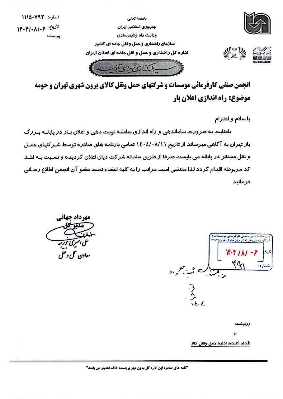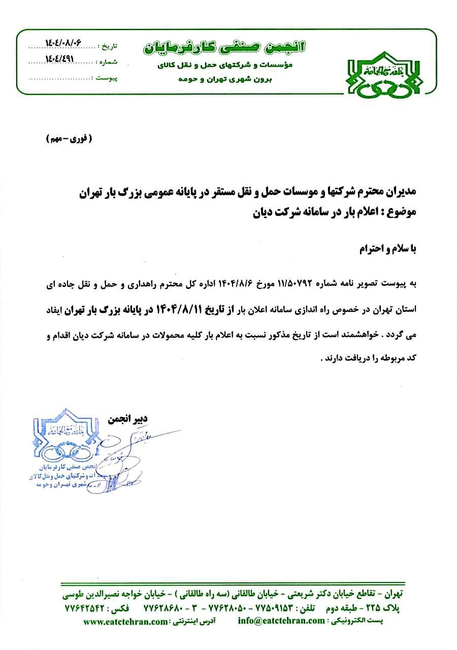 به پیوست تصویر نامه شماره 50792/11 مورخ 6/8/1404 اداره کل محترم راهداری و حمل و نقل جاده ای استان تهران در خصوص راه اندازی سامانه اعلان بار از تاریخ 11/8/1404 در پایانه بزرگ بار تهران ایفاد می گردد . خواهشمند است از تاریخ مذکور نسبت به اعلام بار کلیه محمولات در سامانه شرکت دیان اقدام و کد مربوطه را دریافت دارند .