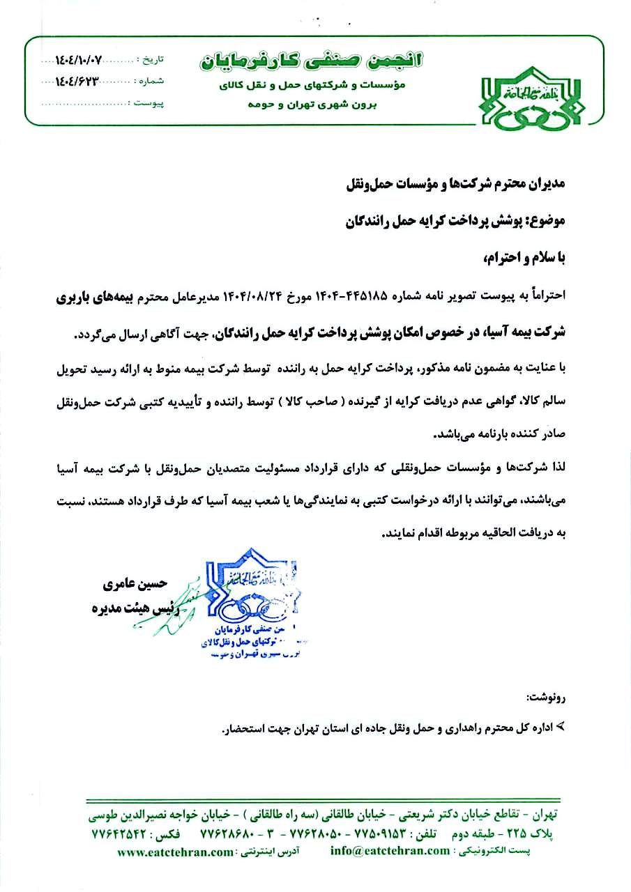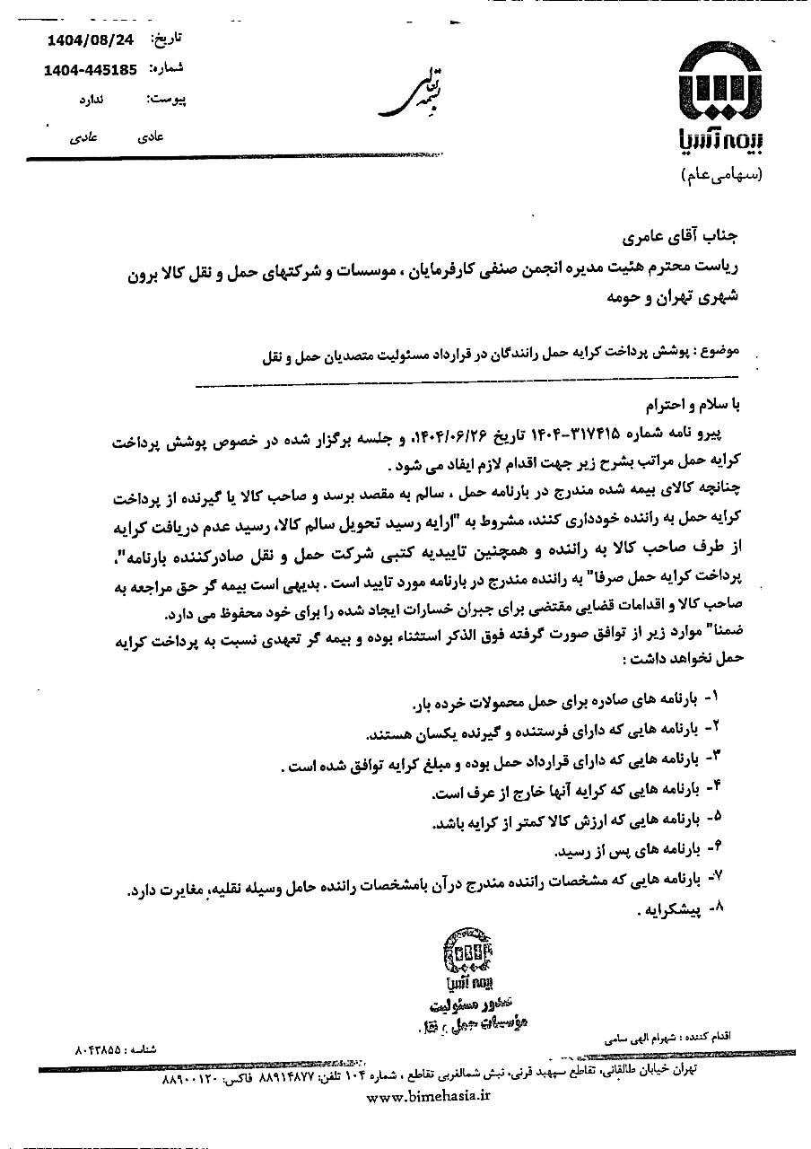 احتراماً به پیوست تصویر نامه شماره 445185-1404 مورخ 24/08/1404 مدیرعامل محترم بیمههای باربری شرکت بیمه آسیا، در خصوص امکان پوشش پرداخت کرایه حمل رانندگان، جهت آگاهی ارسال میگردد. با عنایت به مضمون نامه مذکور، پرداخت کرایه حمل به راننده توسط شرکت بیمه منوط به ارائه رسید تحویل سالم کالا، گواهی عدم دریافت کرایه از گیرنده ( صاحب کالا ) توسط راننده و تأییدیه کتبی شرکت حملونقل صادر کننده بارنامه میباشد.