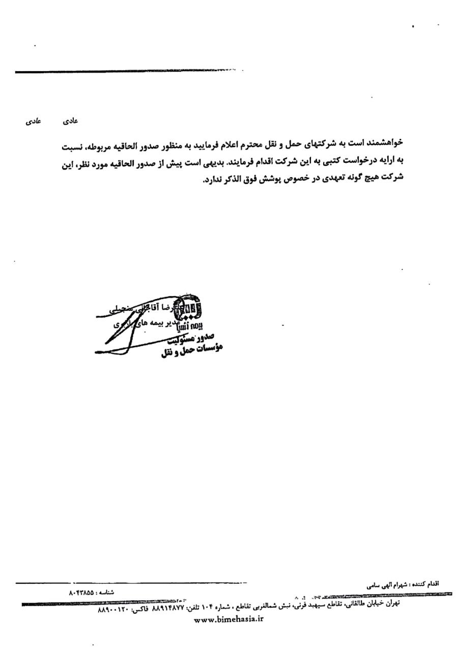 لذا شرکتها و مؤسسات حملونقلی که دارای قرارداد مسئولیت متصدیان حملونقل با شرکت بیمه آسیا میباشند، میتوانند با ارائه درخواست کتبی به نمایندگیها یا شعب بیمه آسیا که طرف قرارداد هستند، نسبت به دریافت الحاقیه مربوطه اقدام نمایند.