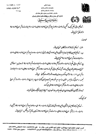 اداره كل محترم حمل و نقل و پايانههاي استان تهران با ارسال بخشنامهاي به انجمن صنفي مؤسسات و شركتهاي حمل و نقل كالاي تهران، محدوديتهاي ترافيكي اعلام شده از سوي مركز مديريت راهها براي پايان آخرين هفته تير ماه - از روز چهارشنبه 24 تا يكشنبه 28 تير ماه سال 1394 را اعلان كرد. تصاوير چهار اين نامه چهار صفحهاي و نيز متن چاپخور آن در ادامه تقديم شده است: